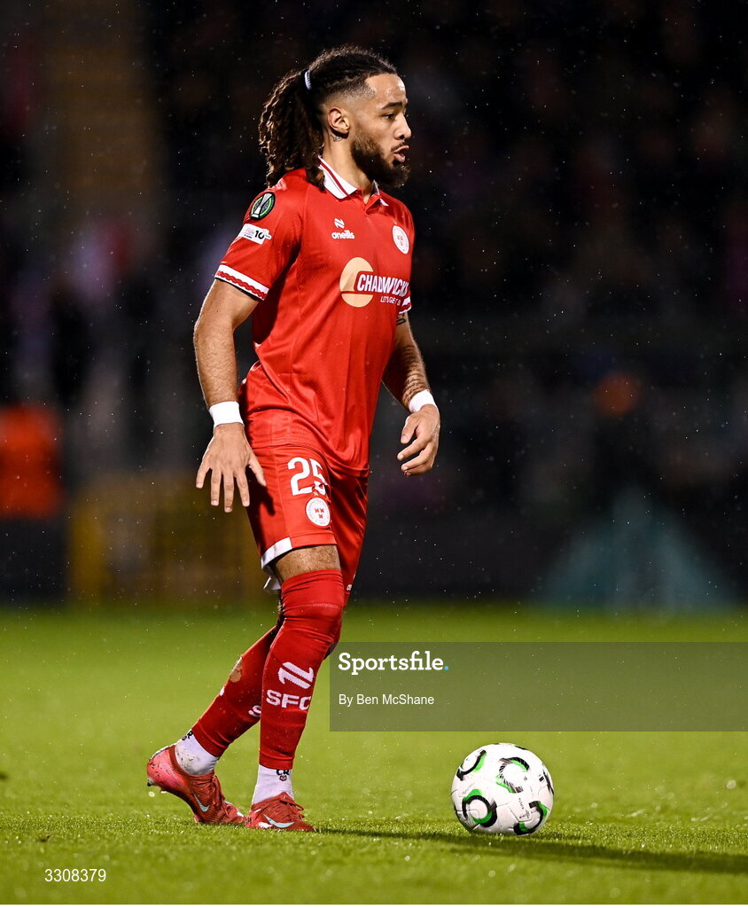 11 December 2025; Milan Mbeng of Shelbourne during the UEFA Conference League 2025/26 league phase match between Shelbourne and Crystal Palace at Tallaght Stadium in Dublin. Photo by Ben McShane/Sportsfile