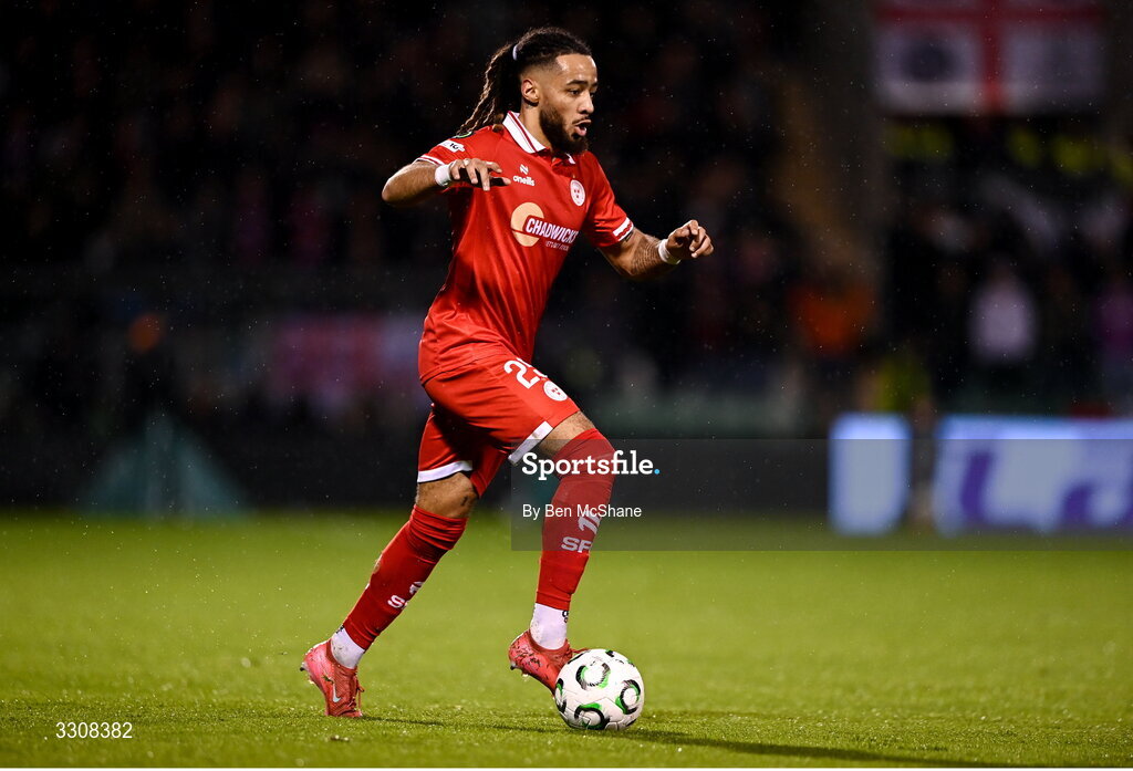 11 December 2025; Milan Mbeng of Shelbourne during the UEFA Conference League 2025/26 league phase match between Shelbourne and Crystal Palace at Tallaght Stadium in Dublin. Photo by Ben McShane/Sportsfile