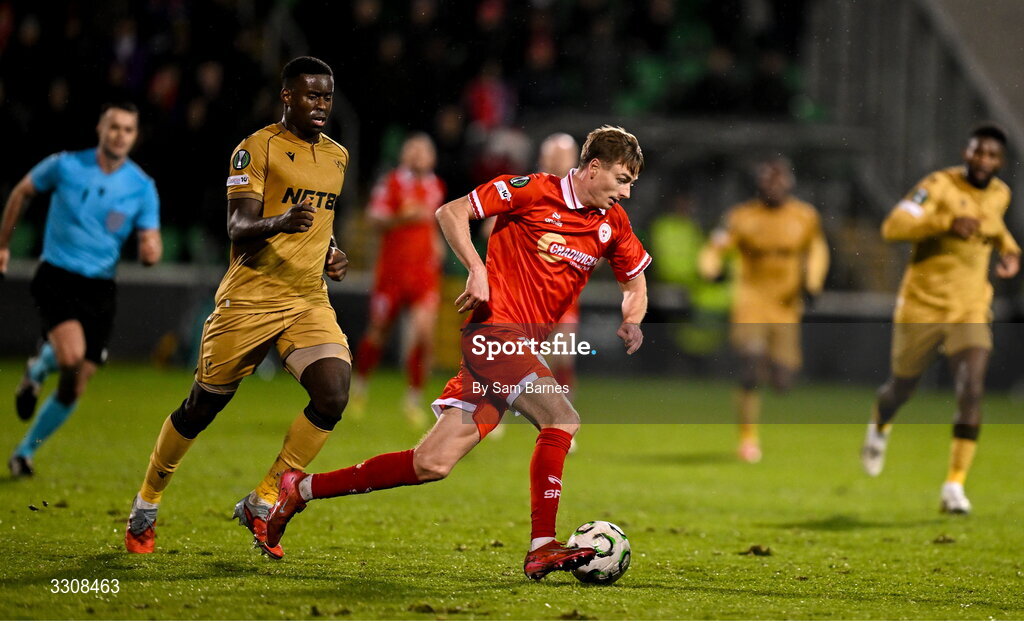 11 December 2025; Daniel Kelly of Shelbourne in action against Marc Guéhi of Crystal Palace during the UEFA Conference League 2025/26 league phase match between Shelbourne and Crystal Palace at Tallaght Stadium in Dublin. Photo by Sam Barnes/Sportsfile
