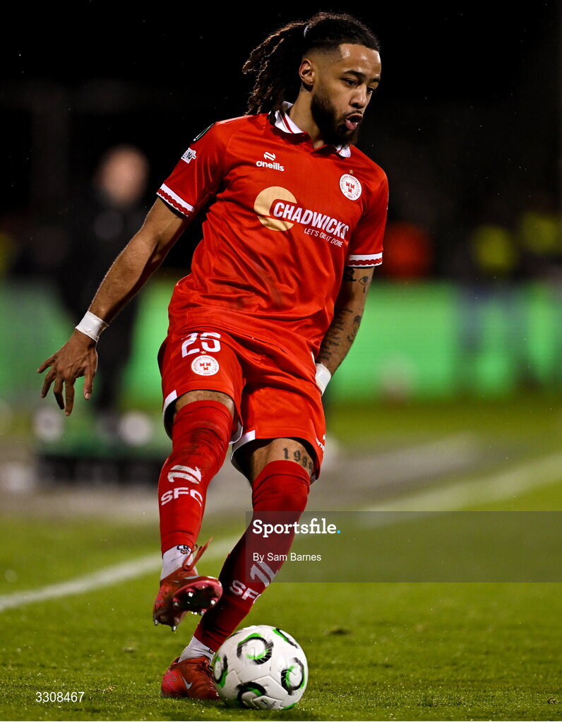 11 December 2025; Milan Mbeng of Shelbourne during the UEFA Conference League 2025/26 league phase match between Shelbourne and Crystal Palace at Tallaght Stadium in Dublin. Photo by Sam Barnes/Sportsfile