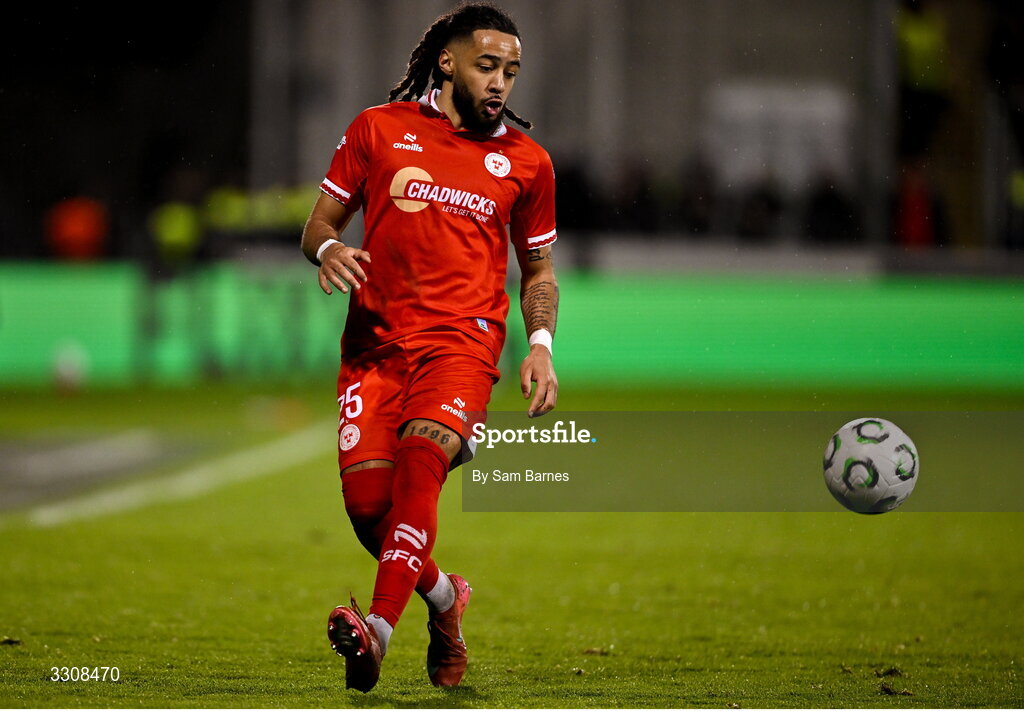 11 December 2025; Milan Mbeng of Shelbourne during the UEFA Conference League 2025/26 league phase match between Shelbourne and Crystal Palace at Tallaght Stadium in Dublin. Photo by Sam Barnes/Sportsfile