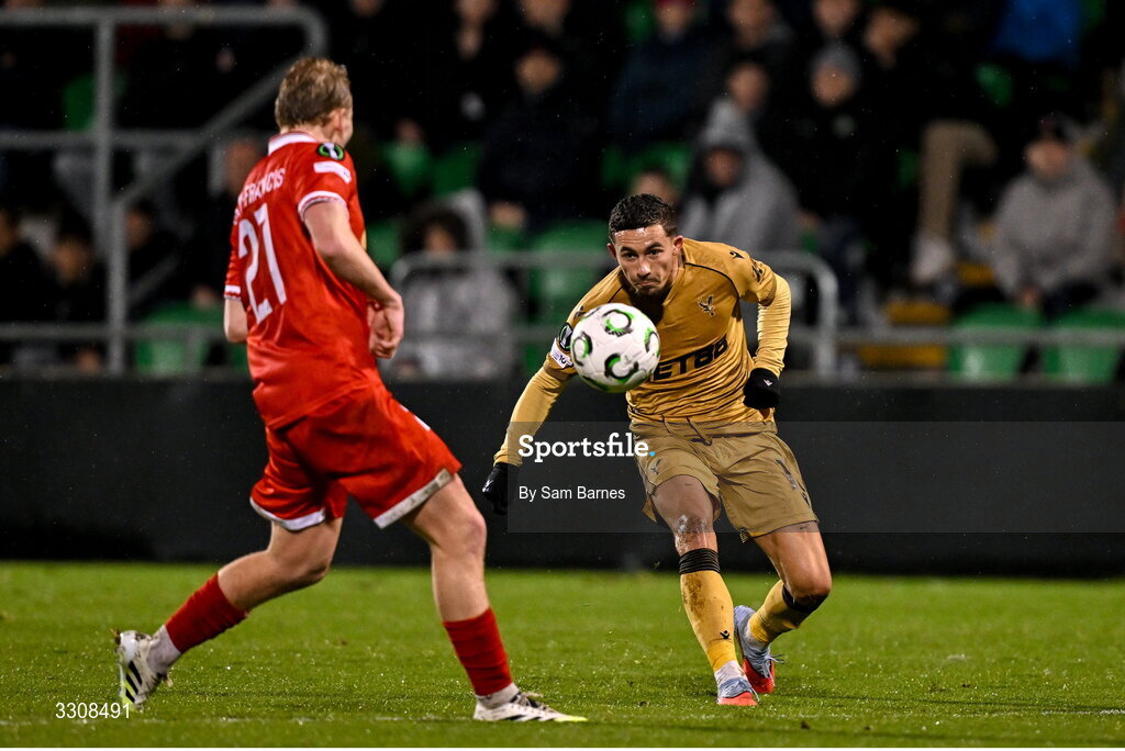 11 December 2025; Yeremy Pino of Crystal Palace in action against Jack Henry-Francis of Shelbourne during the UEFA Conference League 2025/26 league phase match between Shelbourne and Crystal Palace at Tallaght Stadium in Dublin. Photo by Sam Barnes/Sportsfile