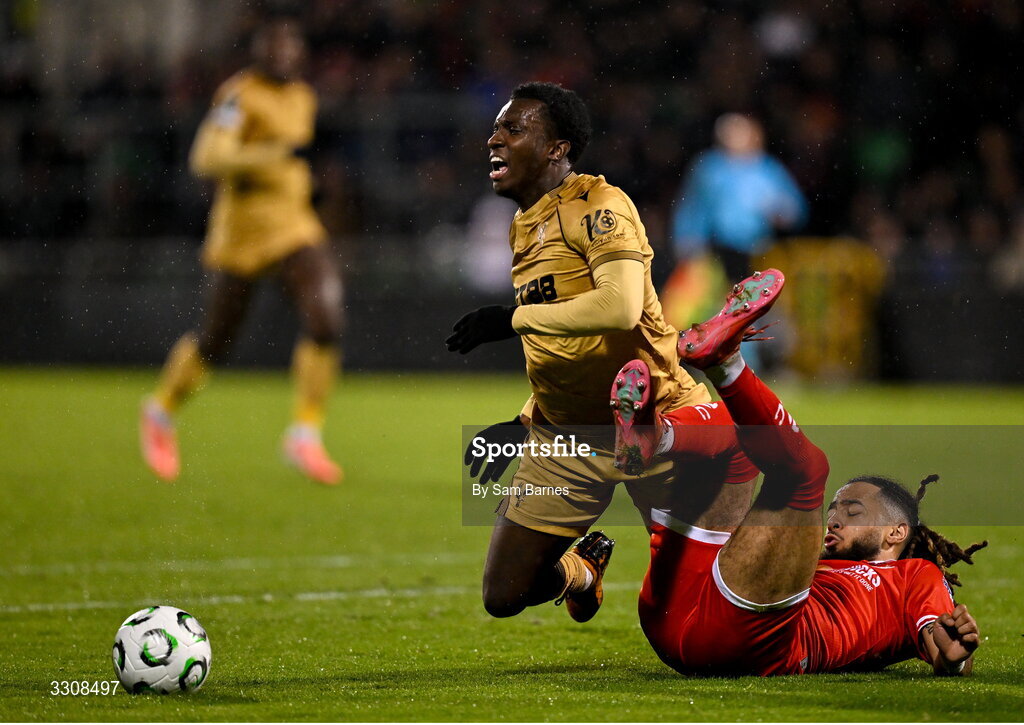 11 December 2025; Eddie Nketiah of Crystal Palace is tackled by Milan Mbeng of Shelbourne during the UEFA Conference League 2025/26 league phase match between Shelbourne and Crystal Palace at Tallaght Stadium in Dublin. Photo by Sam Barnes/Sportsfile