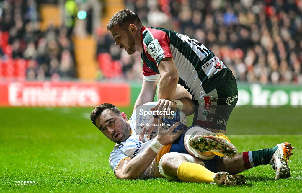 12 December 2025; Jack Conan of Leinster is tackled by Freddie Steward of Leicester Tigers during the Investec Champions Cup match between Leicester Tigers and Leinster at Mattioli Woods Welford Road in Leicester, England. Photo by Brendan Moran/Sportsfile