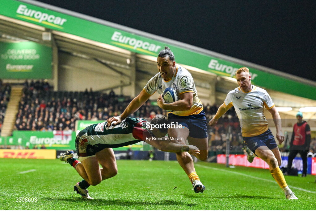 12 December 2025; James Lowe of Leinster is tackled by Will Wand of Leicester Tigers during the Investec Champions Cup match between Leicester Tigers and Leinster at Mattioli Woods Welford Road in Leicester, England. Photo by Brendan Moran/Sportsfile