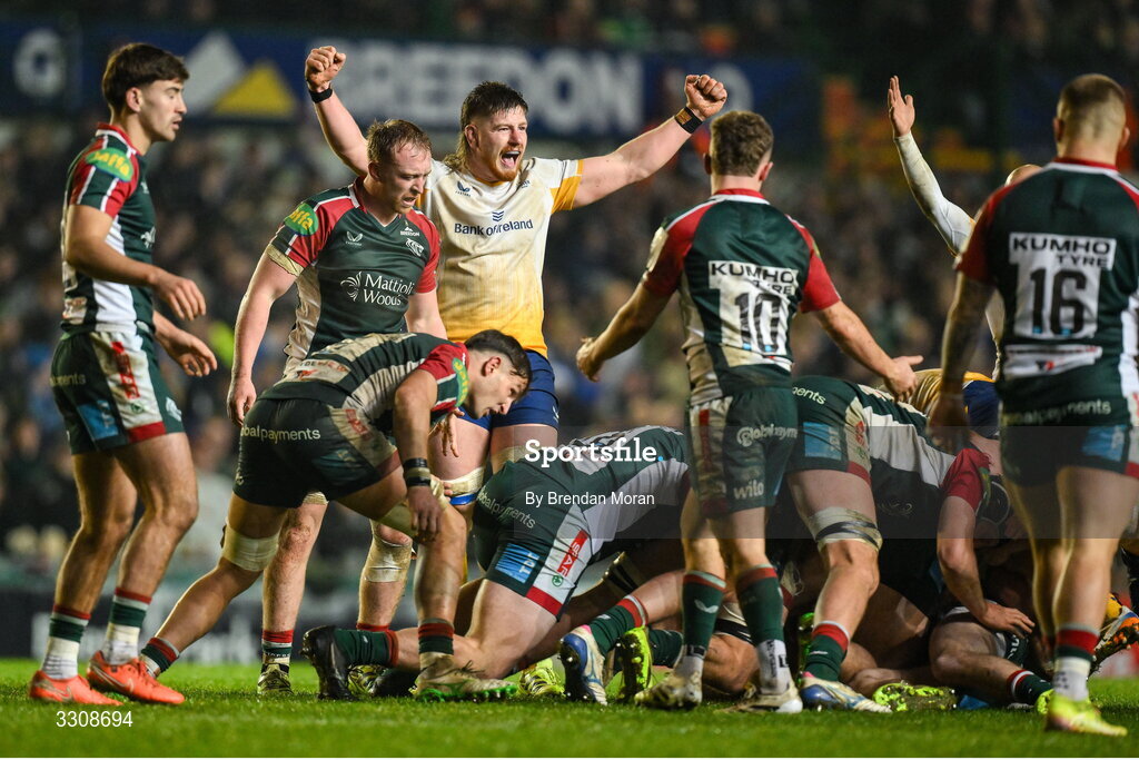 12 December 2025; Joe McCarthy of Leinster celebrates during the Investec Champions Cup match between Leicester Tigers and Leinster at Mattioli Woods Welford Road in Leicester, England. Photo by Brendan Moran/Sportsfile