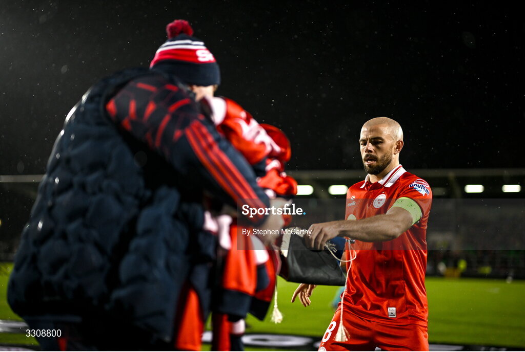 11 December 2025; Shelbourne captain Mark Coyle and equipment manager Graham Watson before the UEFA Conference League 2025/26 league phase match between Shelbourne and Crystal Palace at Tallaght Stadium in Dublin. Photo by Stephen McCarthy/Sportsfile