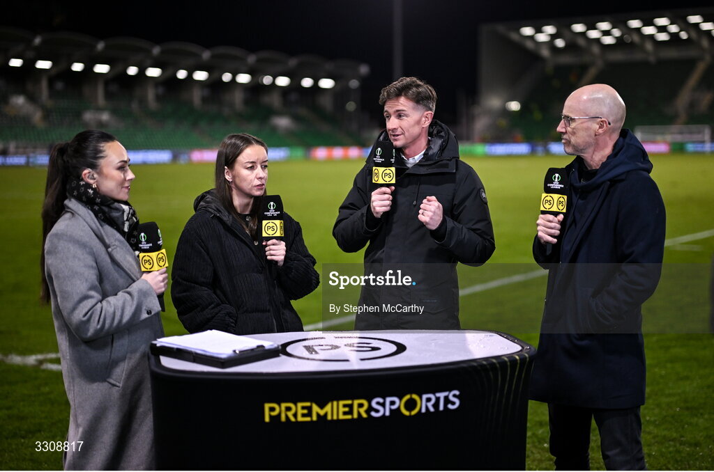 11 December 2025; Premier Sports presenter Aisling O’Reilly, left, with pundits, from left, Pearl Slattery, Ronan Finn and Kenny Cunningham during the UEFA Conference League 2025/26 league phase match between Shelbourne and Crystal Palace at Tallaght Stadium in Dublin. Photo by Stephen McCarthy/Sportsfile