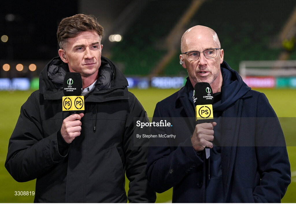 11 December 2025; Premier Sports pundits Kenny Cunningham, right, and Ronan Finn during the UEFA Conference League 2025/26 league phase match between Shelbourne and Crystal Palace at Tallaght Stadium in Dublin. Photo by Stephen McCarthy/Sportsfile