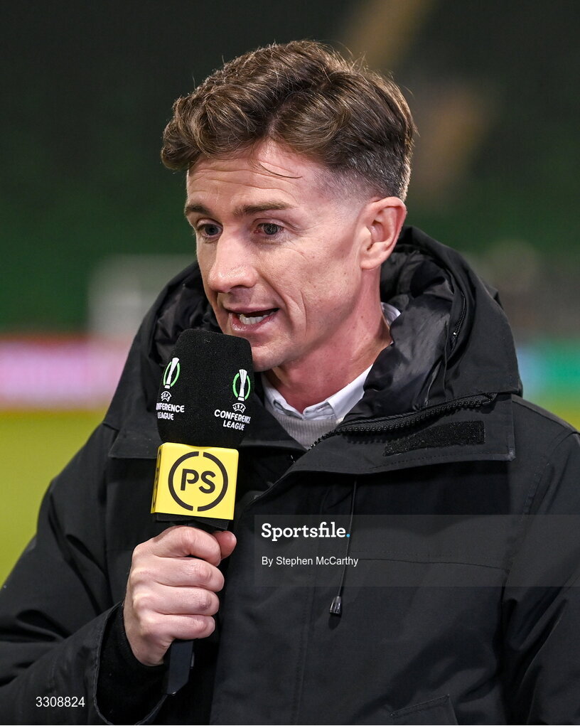 11 December 2025; Premier Sports pundit Ronan Finn during the UEFA Conference League 2025/26 league phase match between Shelbourne and Crystal Palace at Tallaght Stadium in Dublin. Photo by Stephen McCarthy/Sportsfile