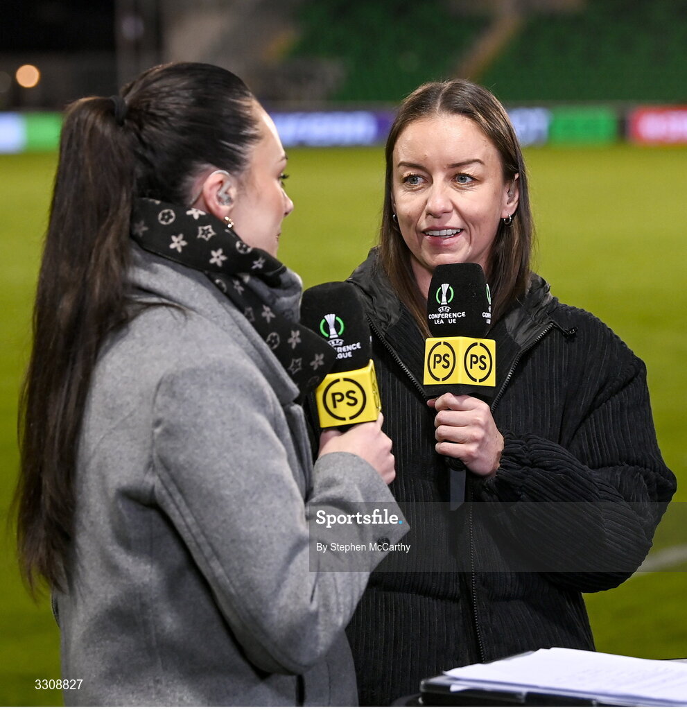 11 December 2025; Premier Sports pundit Pearl Slattery and presenter Aisling O’Reilly, left, during the UEFA Conference League 2025/26 league phase match between Shelbourne and Crystal Palace at Tallaght Stadium in Dublin. Photo by Stephen McCarthy/Sportsfile