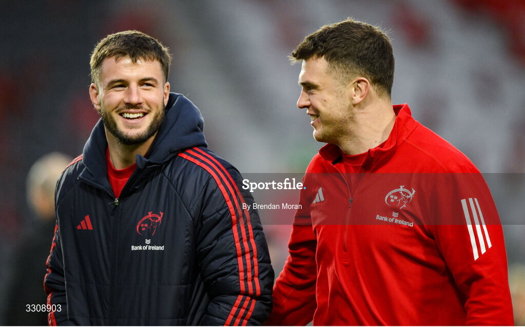 13 December 2025; Alex Nankivell, left, and Tom Farrell of Munster before the Investec Champions Cup match between Munster and Gloucester at SuperValu Páirc Ui Chaoimh in Cork. Photo by Brendan Moran/Sportsfile
