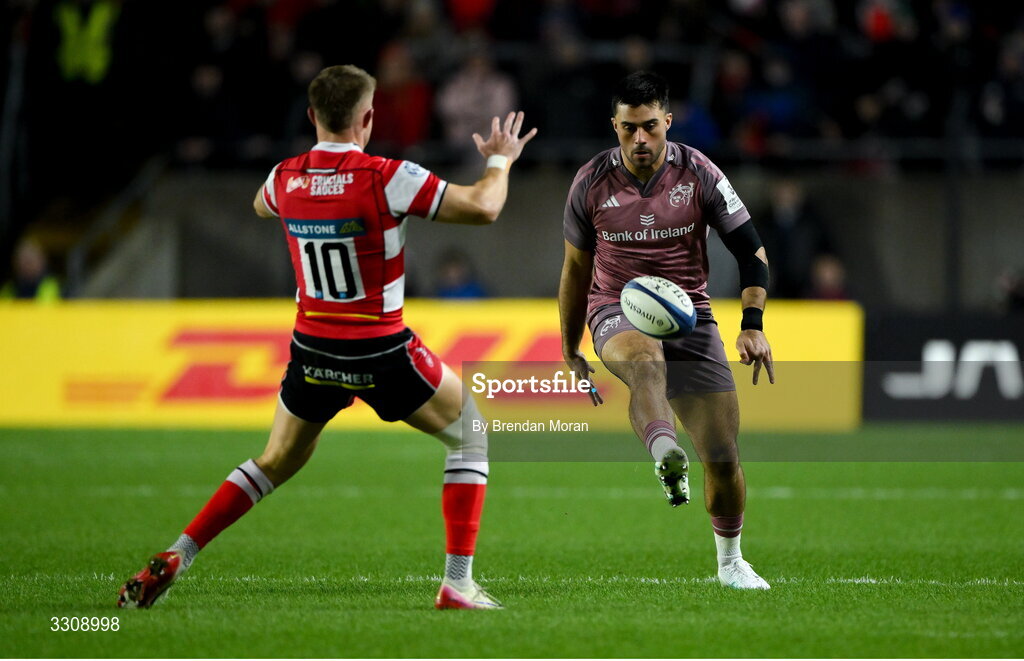 13 December 2025; Dan Kelly of Munster kicks pasts Charlie Atkinson of Gloucester during the Investec Champions Cup match between Munster and Gloucester at SuperValu Páirc Ui Chaoimh in Cork. Photo by Brendan Moran/Sportsfile