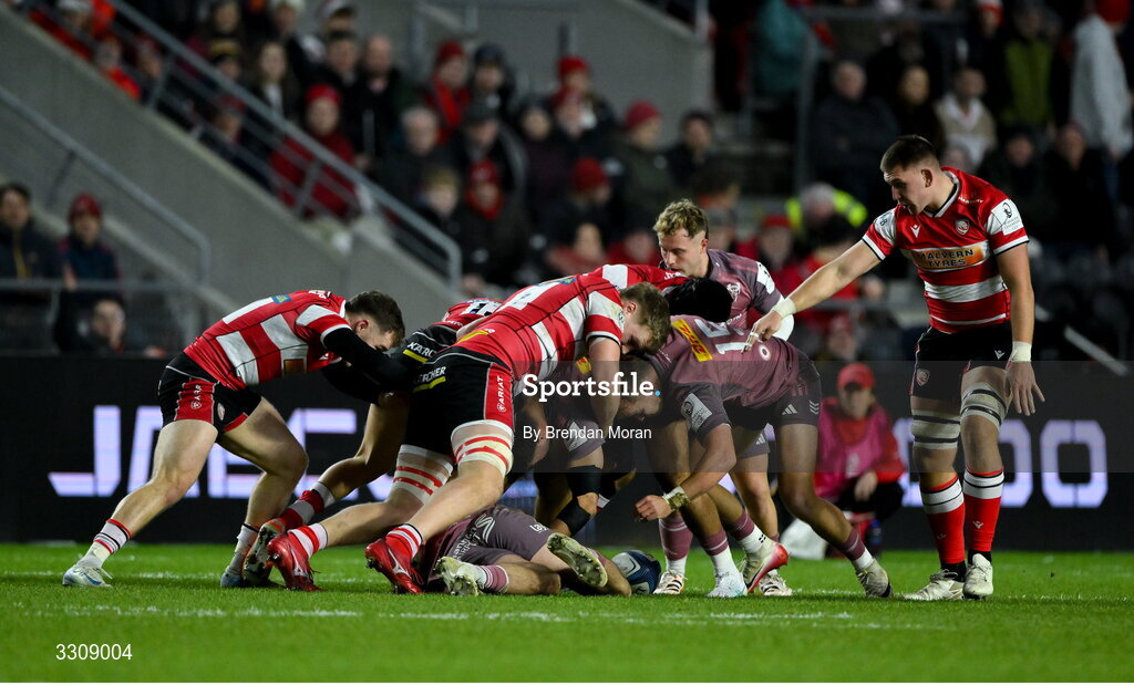 13 December 2025; Both teams contest possession during the Investec Champions Cup match between Munster and Gloucester at SuperValu Páirc Ui Chaoimh in Cork. Photo by Brendan Moran/Sportsfile