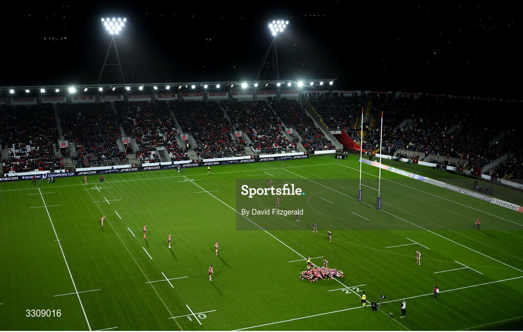 13 December 2025; A general view of a scrum during the Investec Champions Cup match between Munster and Gloucester at SuperValu Páirc Ui Chaoimh in Cork. Photo by David Fitzgerald/Sportsfile