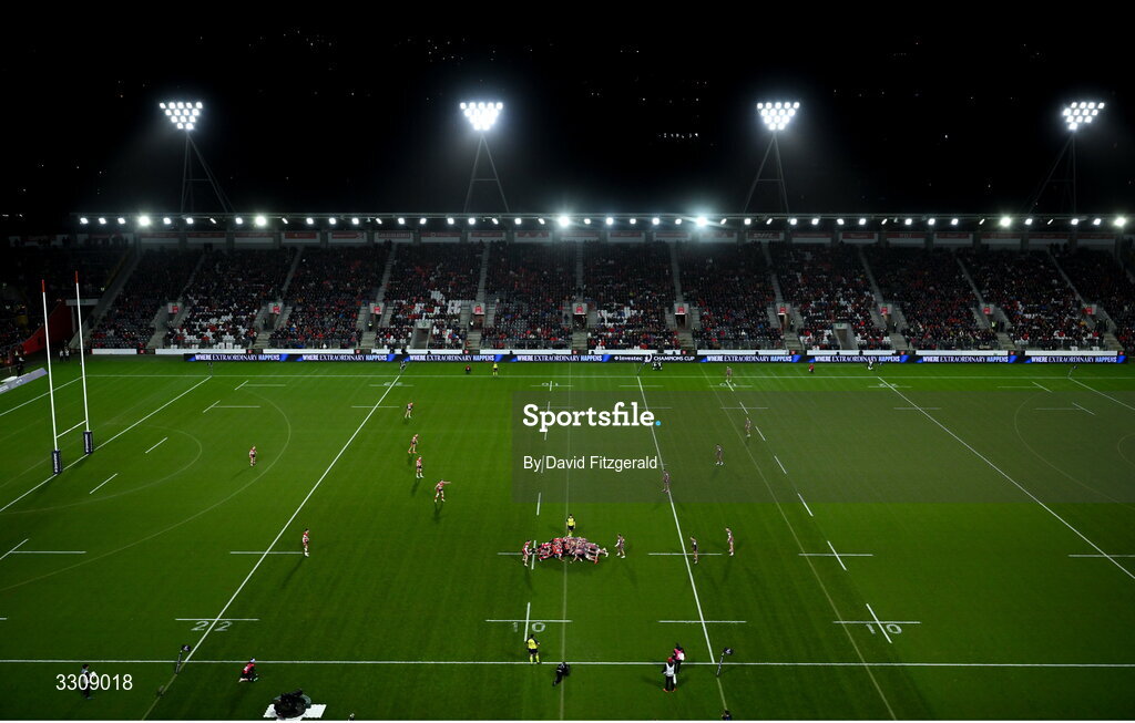 13 December 2025; A general view of a scrum during the Investec Champions Cup match between Munster and Gloucester at SuperValu Páirc Ui Chaoimh in Cork. Photo by David Fitzgerald/Sportsfile