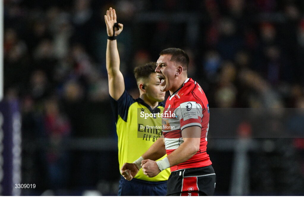 13 December 2025; Harry Taylor of Gloucester celebrates winning a scrum-penalty during the Investec Champions Cup match between Munster and Gloucester at SuperValu Páirc Ui Chaoimh in Cork. Photo by Brendan Moran/Sportsfile