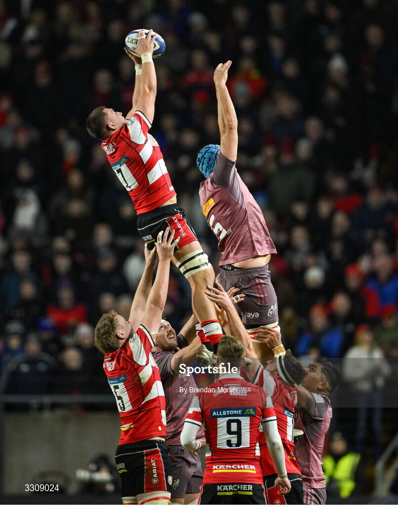 13 December 2025; Harry Taylor of Gloucester wins possession in the lineout against Tadhg Beirne of Munster during the Investec Champions Cup match between Munster and Gloucester at SuperValu Páirc Ui Chaoimh in Cork. Photo by Brendan Moran/Sportsfile