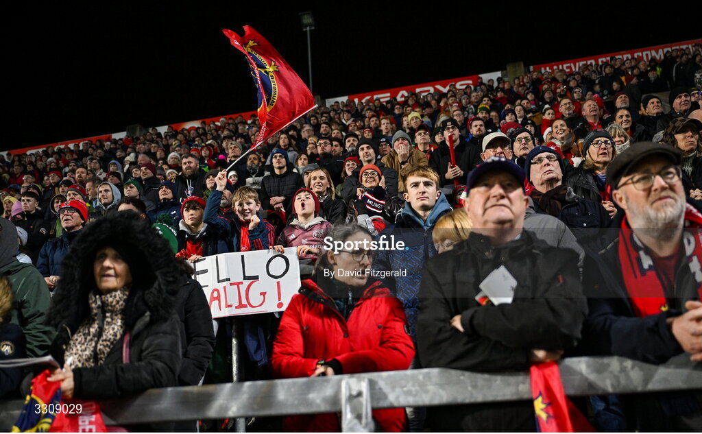 13 December 2025; Munster supporters watch from the terrace during the Investec Champions Cup match between Munster and Gloucester at SuperValu Páirc Ui Chaoimh in Cork. Photo by David Fitzgerald/Sportsfile