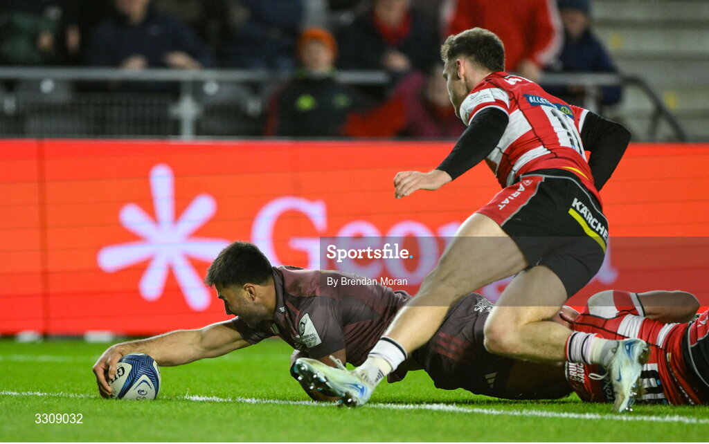 13 December 2025; Dan Kelly of Munster scores his side's first try during the Investec Champions Cup match between Munster and Gloucester at SuperValu Páirc Ui Chaoimh in Cork. Photo by Brendan Moran/Sportsfile