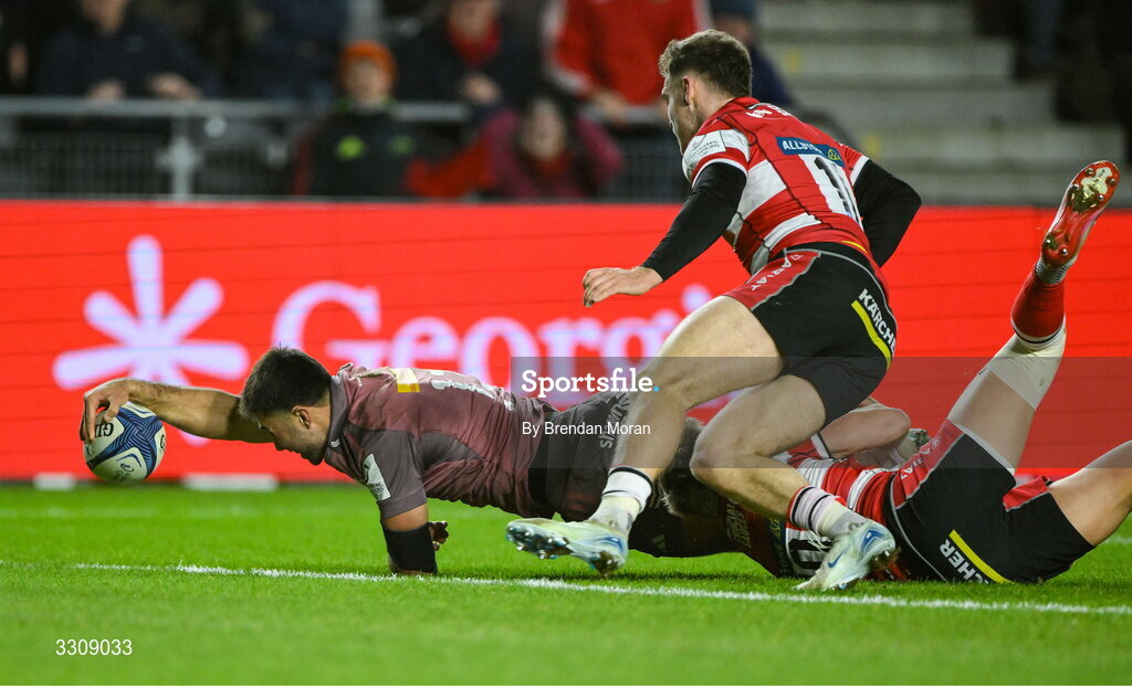 13 December 2025; Dan Kelly of Munster scores his side's first try during the Investec Champions Cup match between Munster and Gloucester at SuperValu Páirc Ui Chaoimh in Cork. Photo by Brendan Moran/Sportsfile