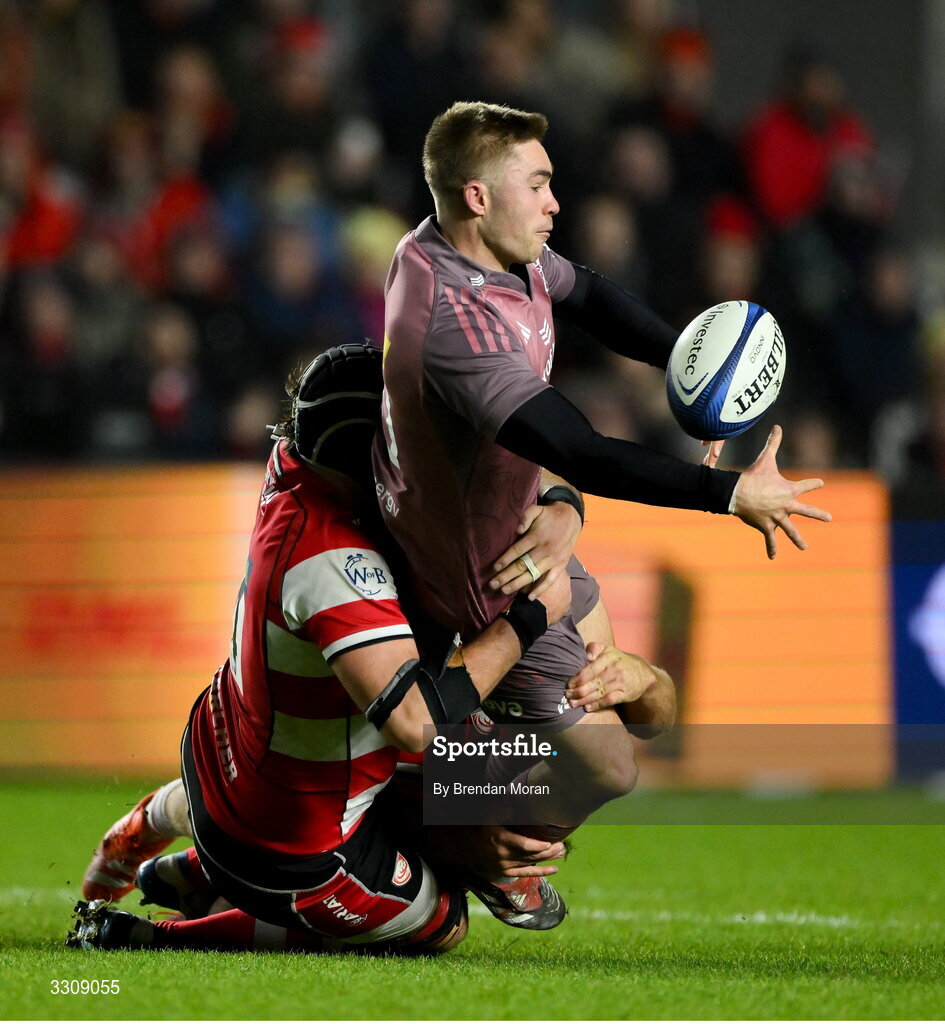 13 December 2025; Jack Crowley of Munster offloads as he is tackled by Cam Jordan, left, and Jack Innard of Gloucester during the Investec Champions Cup match between Munster and Gloucester at SuperValu Páirc Ui Chaoimh in Cork. Photo by Brendan Moran/Sportsfile