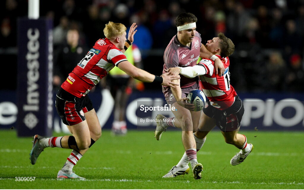 13 December 2025; Shane Daly of Munster is tackled by Max Knight, left, and Josh Hathaway of Gloucester during the Investec Champions Cup match between Munster and Gloucester at SuperValu Páirc Ui Chaoimh in Cork. Photo by Brendan Moran/Sportsfile