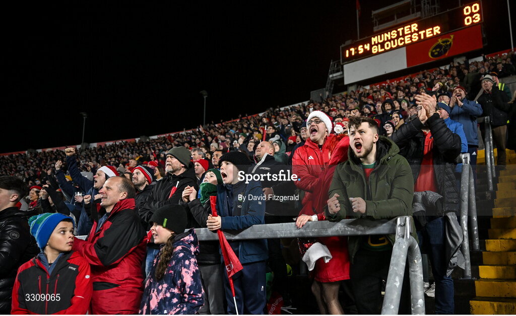 13 December 2025; Munster supporters during the Investec Champions Cup match between Munster and Gloucester at SuperValu Páirc Ui Chaoimh in Cork. Photo by David Fitzgerald/Sportsfile