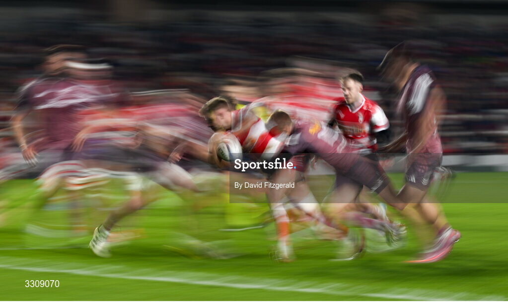 13 December 2025; Charlie Atkinson of Gloucester is tackled by Jack Crowley of Munster during the Investec Champions Cup match between Munster and Gloucester at SuperValu Páirc Ui Chaoimh in Cork. Photo by David Fitzgerald/Sportsfile