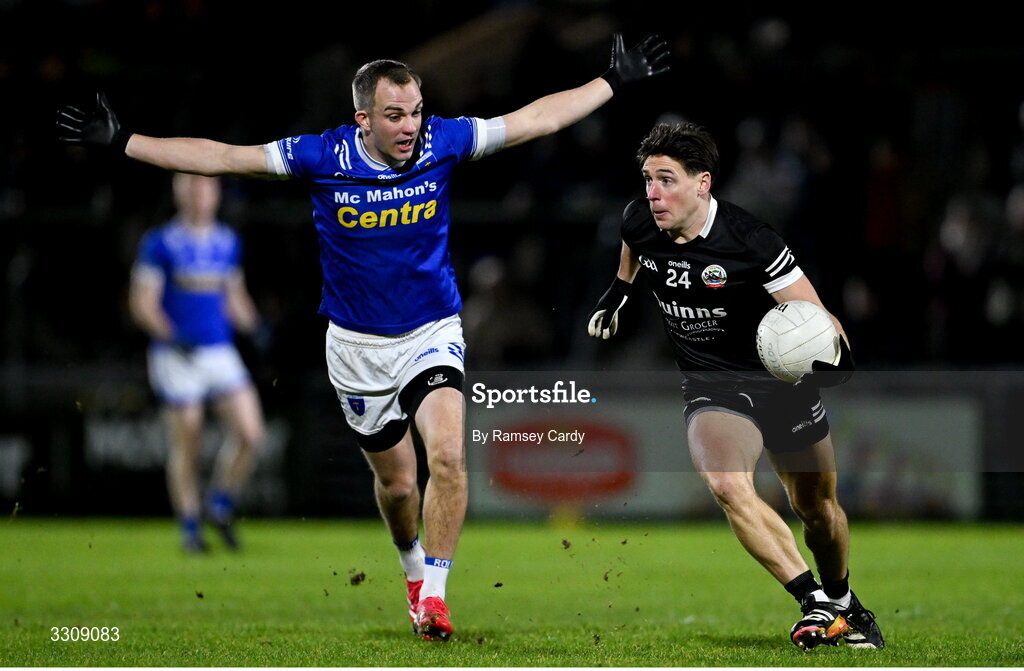 13 December 2025; Aaron Branagan of Kilcoo in action against Jack McCarron of Scotstown during the AIB Ulster GAA Football Senior Club Championship final match between Kilcoo and Scotstown at BOX-IT Athletic Grounds in Armagh. Photo by Ramsey Cardy/Sportsfile