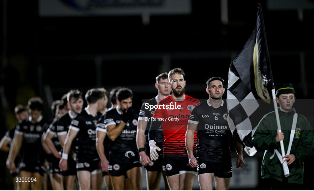 13 December 2025; Kilcoo captain Darryl Branagan leads his side in the parade before the AIB Ulster GAA Football Senior Club Championship final match between Kilcoo and Scotstown at BOX-IT Athletic Grounds in Armagh. Photo by Ramsey Cardy/Sportsfile