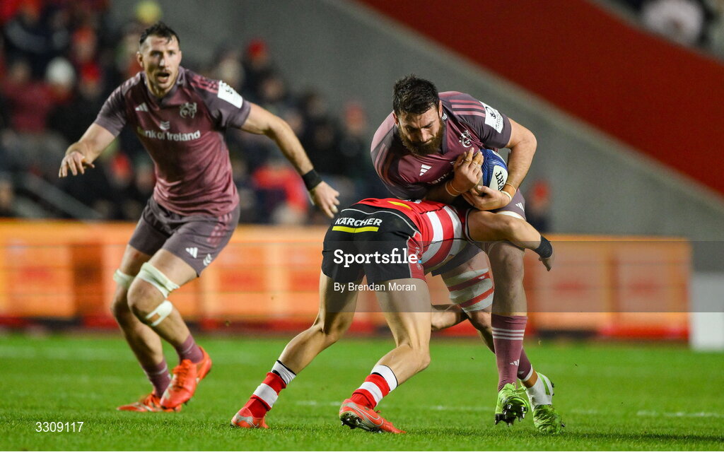 13 December 2025; Jean Kleyn of Munster is tackled by Will Knight of Gloucester during the Investec Champions Cup match between Munster and Gloucester at SuperValu Páirc Ui Chaoimh in Cork. Photo by Brendan Moran/Sportsfile