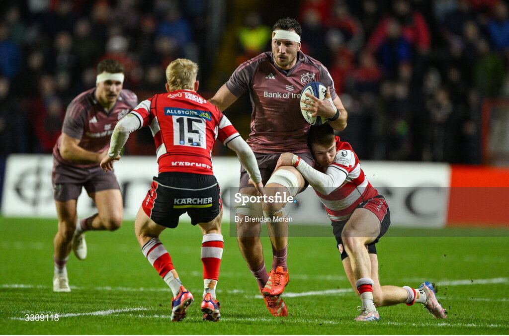 13 December 2025; Tom Ahern of Munster is tackled by Mikey Austin of Gloucester during the Investec Champions Cup match between Munster and Gloucester at SuperValu Páirc Ui Chaoimh in Cork. Photo by Brendan Moran/Sportsfile