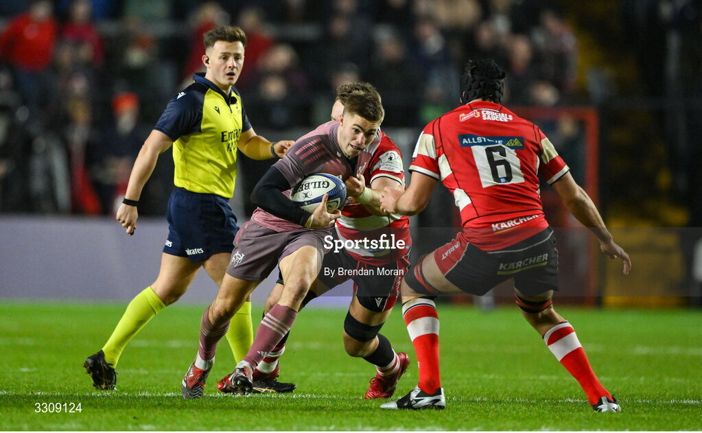 13 December 2025; Jack Crowley of Munster is tackled by Jack Clement of Gloucester during the Investec Champions Cup match between Munster and Gloucester at SuperValu Páirc Ui Chaoimh in Cork. Photo by Brendan Moran/Sportsfile