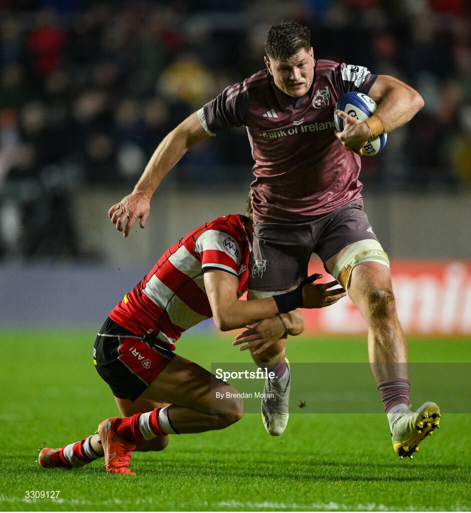 13 December 2025; Jack O'Donoghue of Munster is tackled by Will Knight of Gloucester during the Investec Champions Cup match between Munster and Gloucester at SuperValu Páirc Ui Chaoimh in Cork. Photo by Brendan Moran/Sportsfile