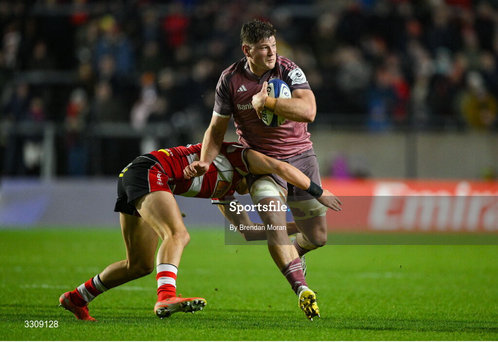 13 December 2025; Jack O'Donoghue of Munster is tackled by Will Knight of Gloucester during the Investec Champions Cup match between Munster and Gloucester at SuperValu Páirc Ui Chaoimh in Cork. Photo by Brendan Moran/Sportsfile