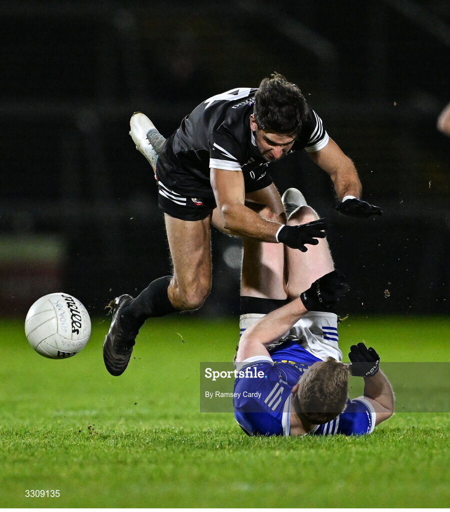 13 December 2025; Niall Branagan of Kilcoo in action against Kieran Hughes of Scotstown during the AIB Ulster GAA Football Senior Club Championship final match between Kilcoo and Scotstown at BOX-IT Athletic Grounds in Armagh. Photo by Ramsey Cardy/Sportsfile