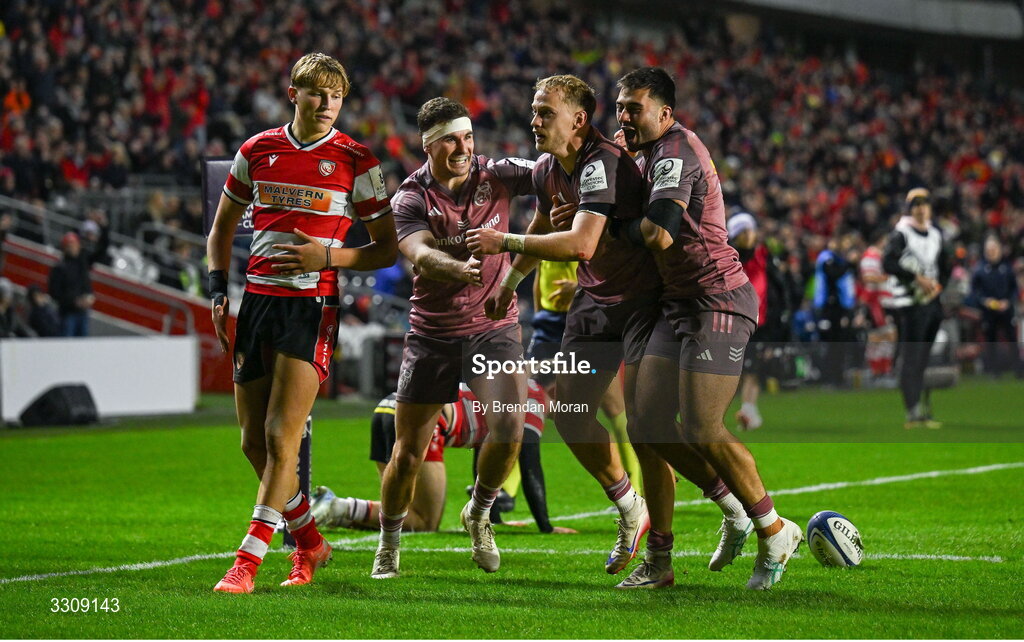 13 December 2025; Mike Haley of Munster celebrates with Shane Daly, left, and Dan Kelly, right, after scoring their side's second try during the Investec Champions Cup match between Munster and Gloucester at SuperValu Páirc Ui Chaoimh in Cork. Photo by Brendan Moran/Sportsfile
