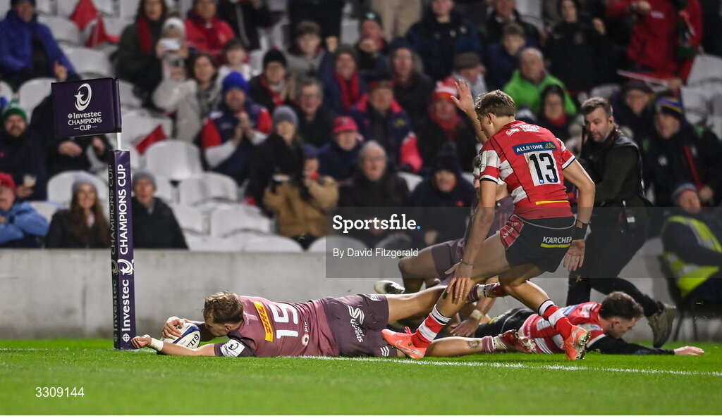 13 December 2025; Mike Haley of Munster scores his side's second try during the Investec Champions Cup match between Munster and Gloucester at SuperValu Páirc Ui Chaoimh in Cork. Photo by David Fitzgerald/Sportsfile