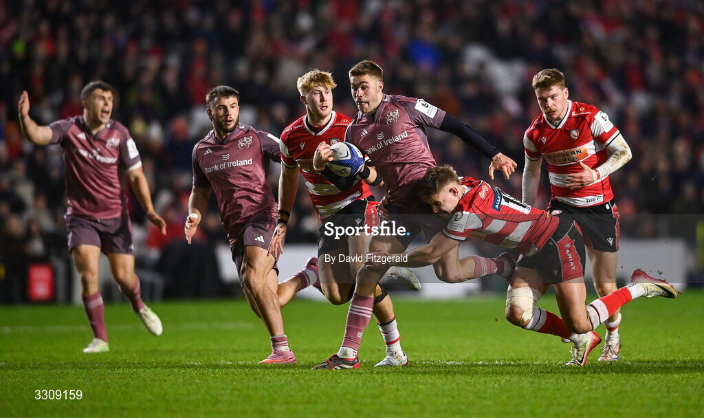 13 December 2025; Jack Crowley of Munster is tackled by Charlie Atkinson of Gloucester during the Investec Champions Cup match between Munster and Gloucester at SuperValu Páirc Ui Chaoimh in Cork. Photo by David Fitzgerald/Sportsfile