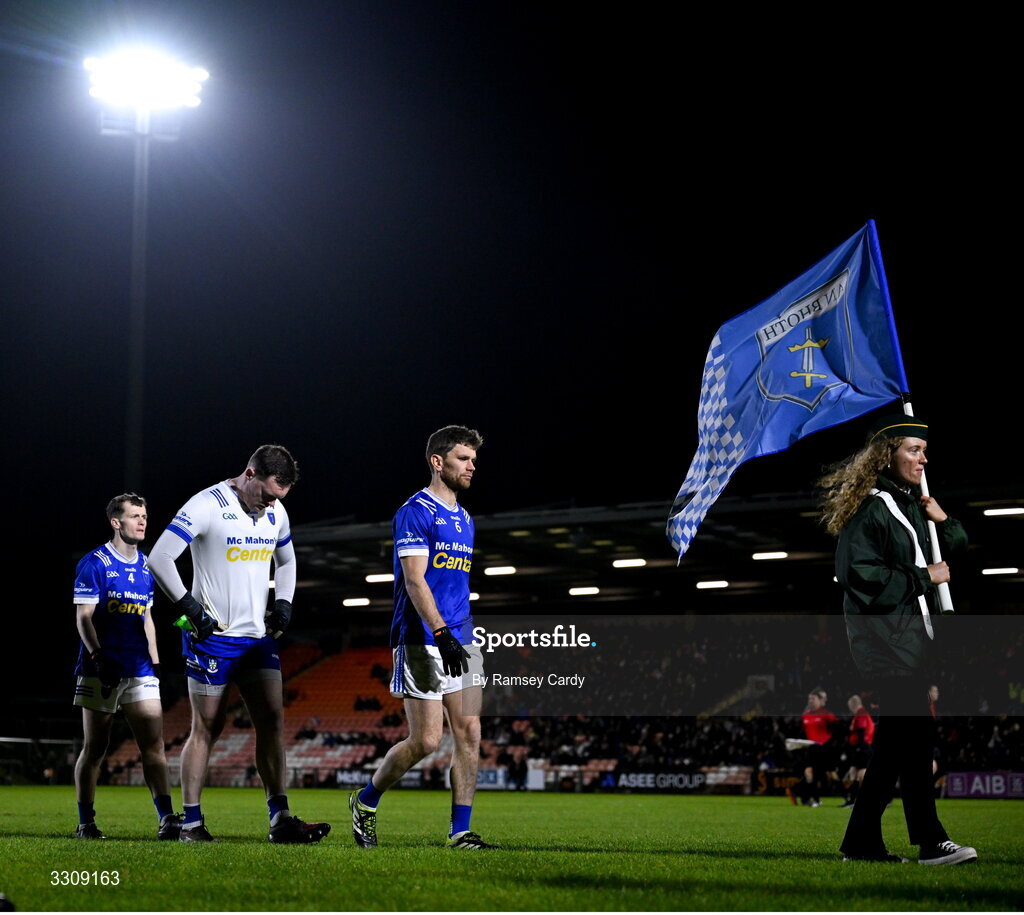 13 December 2025; Scotstown players, from left, Darragh Murray, Rory Beggan and Damien McArdle in the pre-match parade at the AIB Ulster GAA Football Senior Club Championship final match between Kilcoo and Scotstown at BOX-IT Athletic Grounds in Armagh. Photo by Ramsey Cardy/Sportsfile