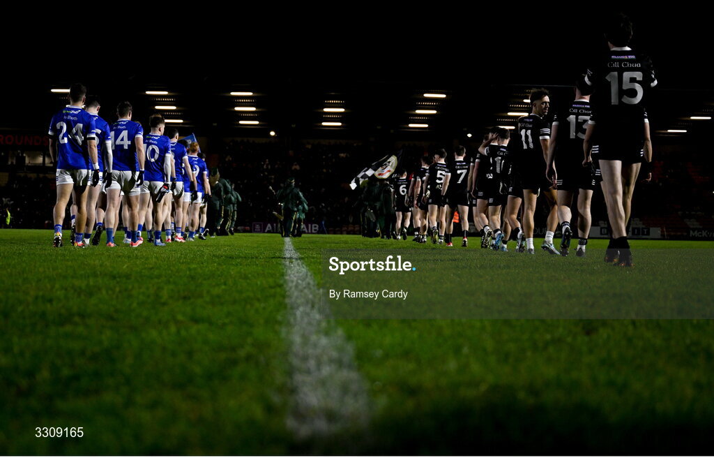 13 December 2025; Both teams parade before the AIB Ulster GAA Football Senior Club Championship final match between Kilcoo and Scotstown at BOX-IT Athletic Grounds in Armagh. Photo by Ramsey Cardy/Sportsfile