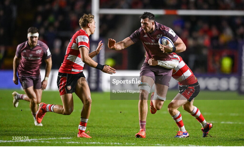 13 December 2025; Tom Ahern of Munster is tackled by George Barton, right, and Will Knight of Gloucester during the Investec Champions Cup match between Munster and Gloucester at SuperValu Páirc Ui Chaoimh in Cork. Photo by David Fitzgerald/Sportsfile