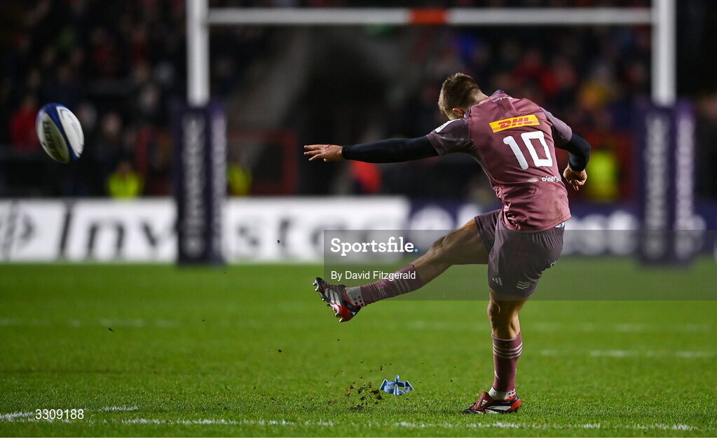 13 December 2025; Jack Crowley of Munster kicks a conversion during the Investec Champions Cup match between Munster and Gloucester at SuperValu Páirc Ui Chaoimh in Cork. Photo by David Fitzgerald/Sportsfile