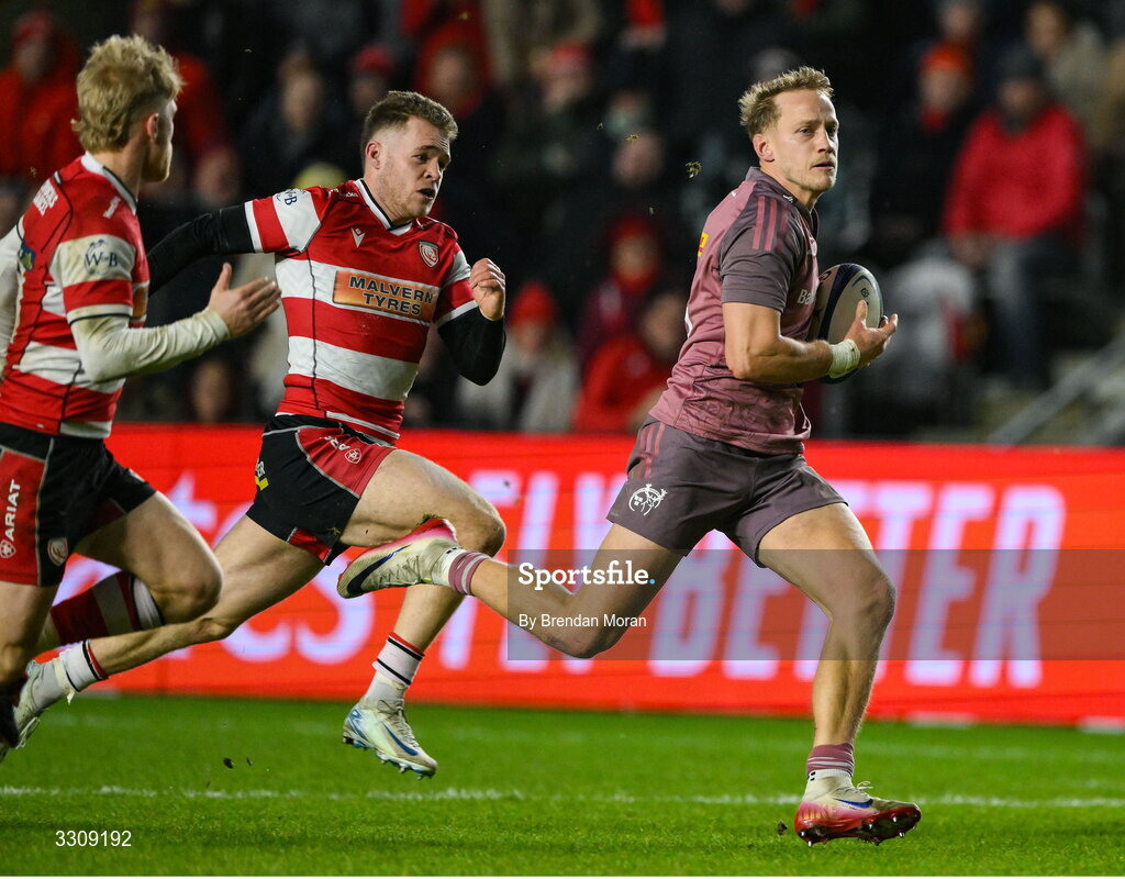 13 December 2025; Mike Haley of Munster makes a break from George Barton, left, and Rob Russell of Gloucester during the Investec Champions Cup match between Munster and Gloucester at SuperValu Páirc Ui Chaoimh in Cork. Photo by Brendan Moran/Sportsfile