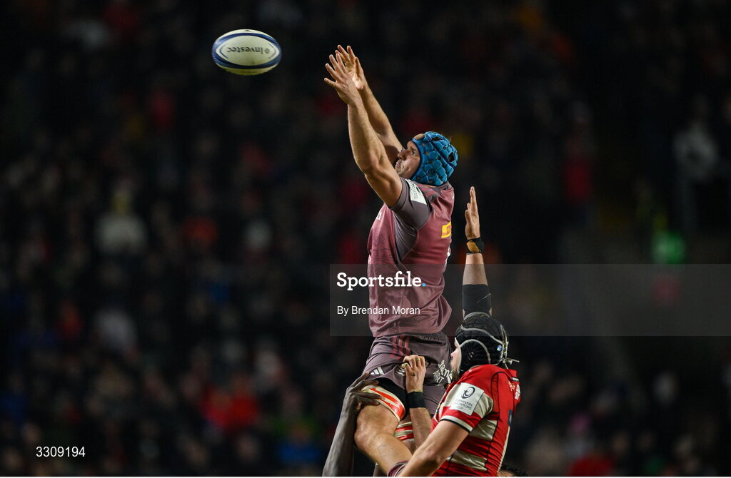13 December 2025; Tadhg Beirne of Munster takes possession in a line-out ahead of Cam Jordan of Gloucester during the Investec Champions Cup match between Munster and Gloucester at SuperValu Páirc Ui Chaoimh in Cork. Photo by Brendan Moran/Sportsfile