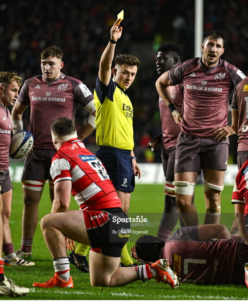 13 December 2025; Referee Ben Breakspear issues a yellow card to Caio James of Gloucester, 21, during the Investec Champions Cup match between Munster and Gloucester at SuperValu Páirc Ui Chaoimh in Cork. Photo by David Fitzgerald/Sportsfile