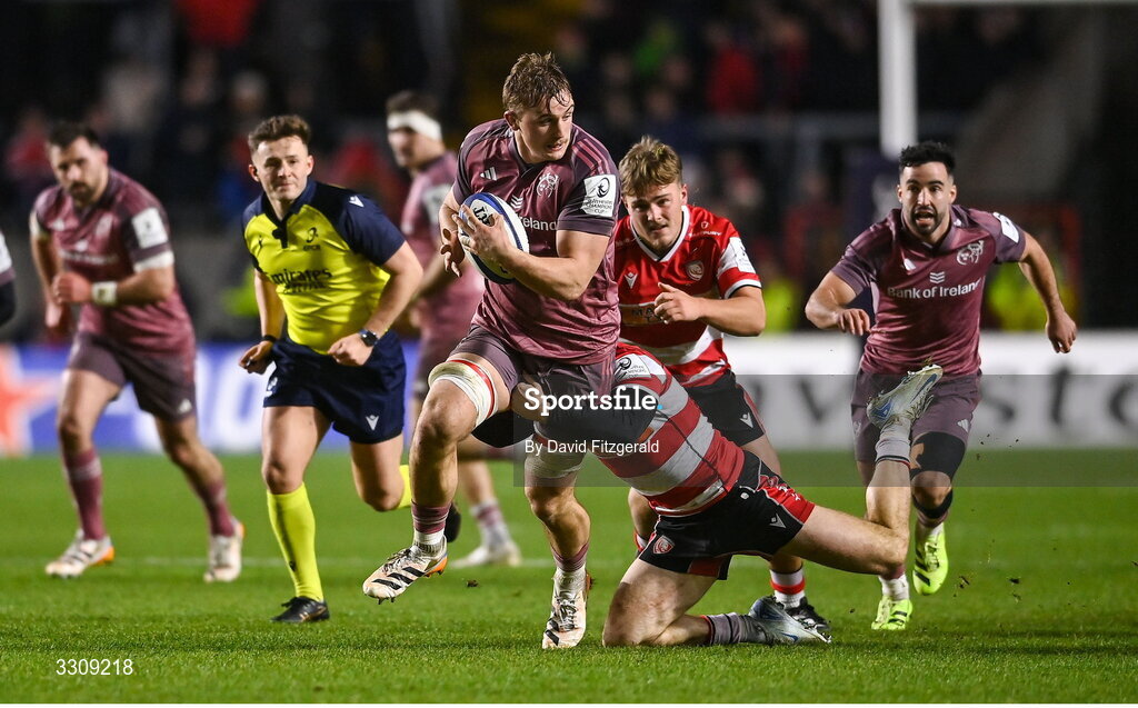 13 December 2025; Gavin Coombes of Munster is tackled by George Barton of Gloucester during the Investec Champions Cup match between Munster and Gloucester at SuperValu Páirc Ui Chaoimh in Cork. Photo by David Fitzgerald/Sportsfile