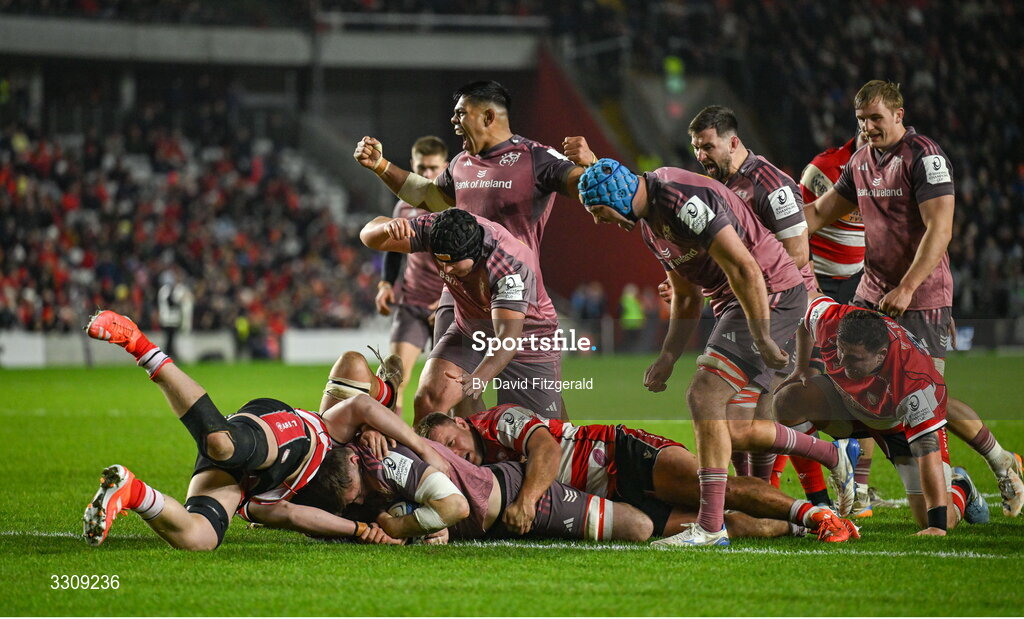 13 December 2025; Ruadhán Quinn of Munster scores his side's third try during the Investec Champions Cup match between Munster and Gloucester at SuperValu Páirc Ui Chaoimh in Cork. Photo by David Fitzgerald/Sportsfile