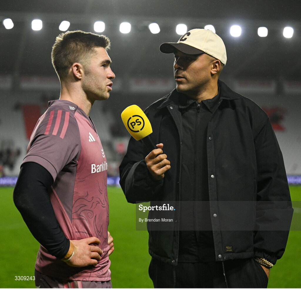 13 December 2025; Jack Crowley of Munster is interviewed by Premier Sports pundit Simon Zebo after the Investec Champions Cup match between Munster and Gloucester at SuperValu Páirc Ui Chaoimh in Cork. Photo by Brendan Moran/Sportsfile